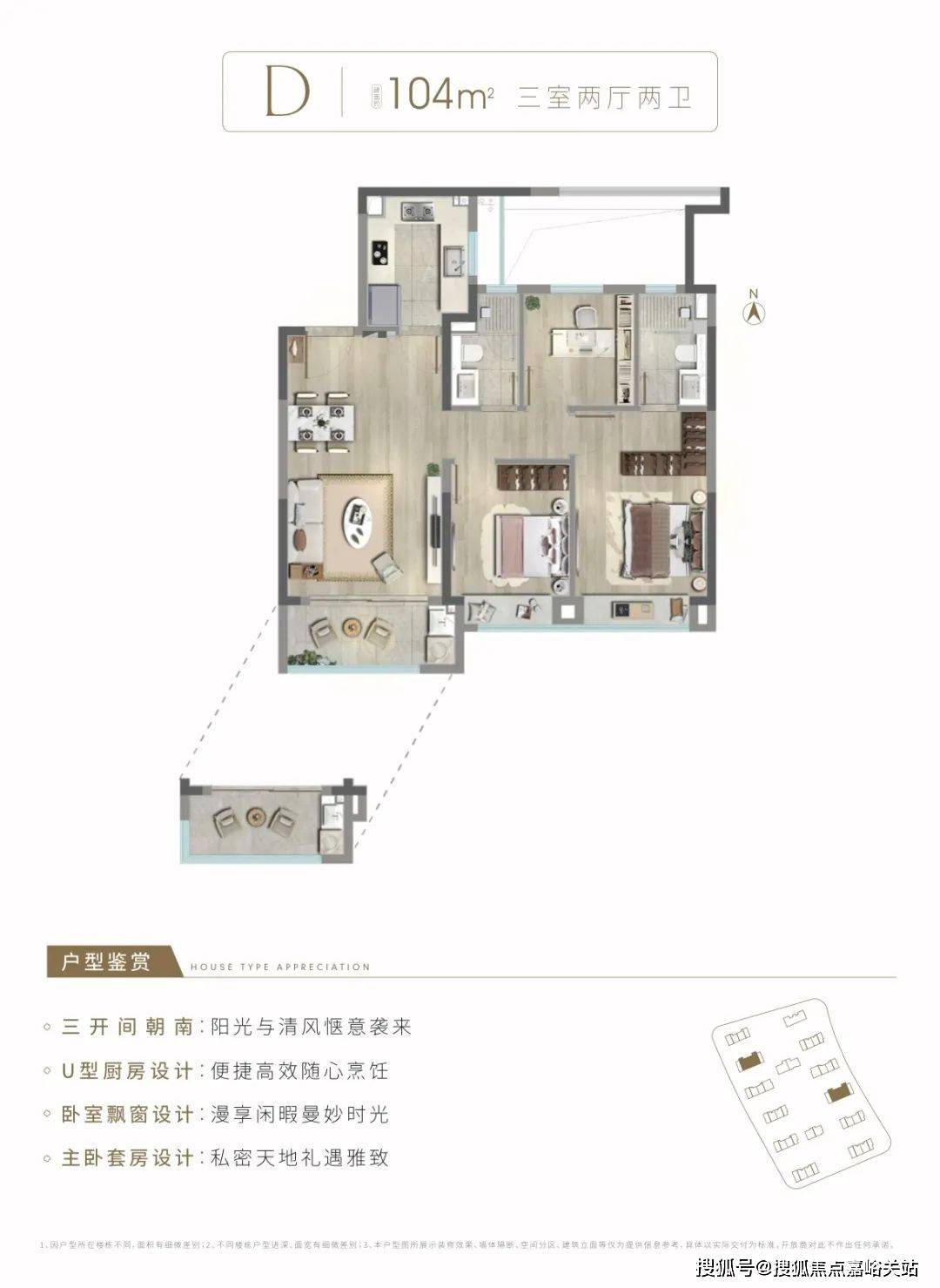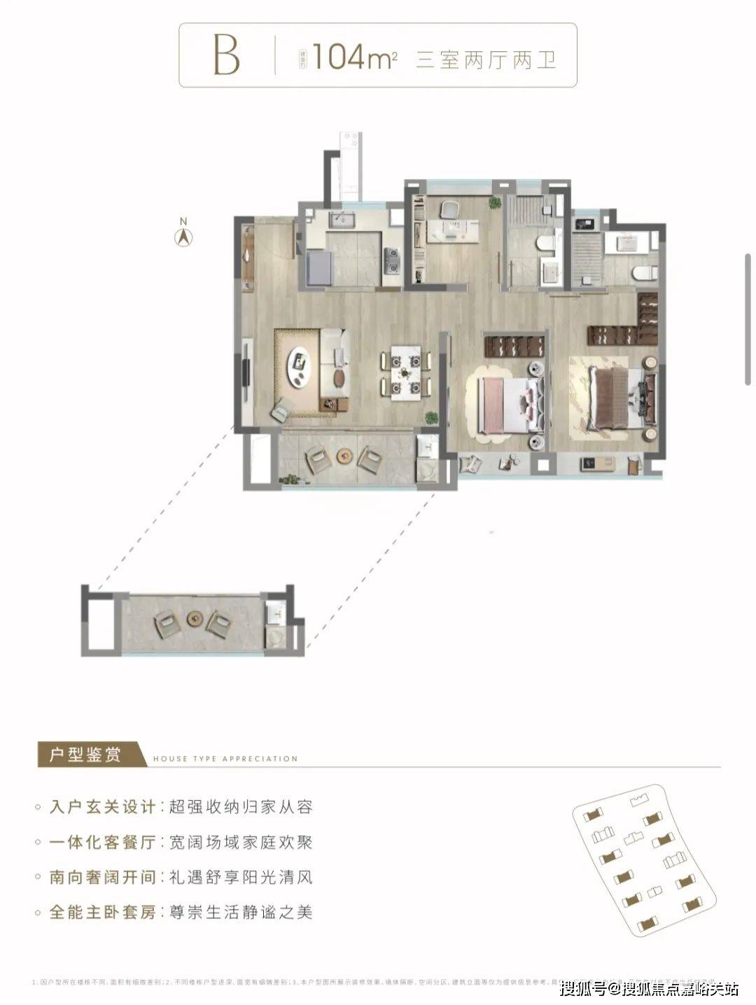 建面约104㎡3房2厅2卫,中间套B户型,做到了四开间朝南+全卧室带飘窗+主卧套房设计
