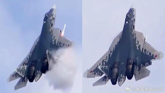 可见导弹尾焰烧黑了靠近侧弹舱附近的机翼蒙皮对涂料有很糟糕的影响,但是苏57不怎么重视隐形所以无所谓。苏57发射格斗弹的尾焰状态看图5。