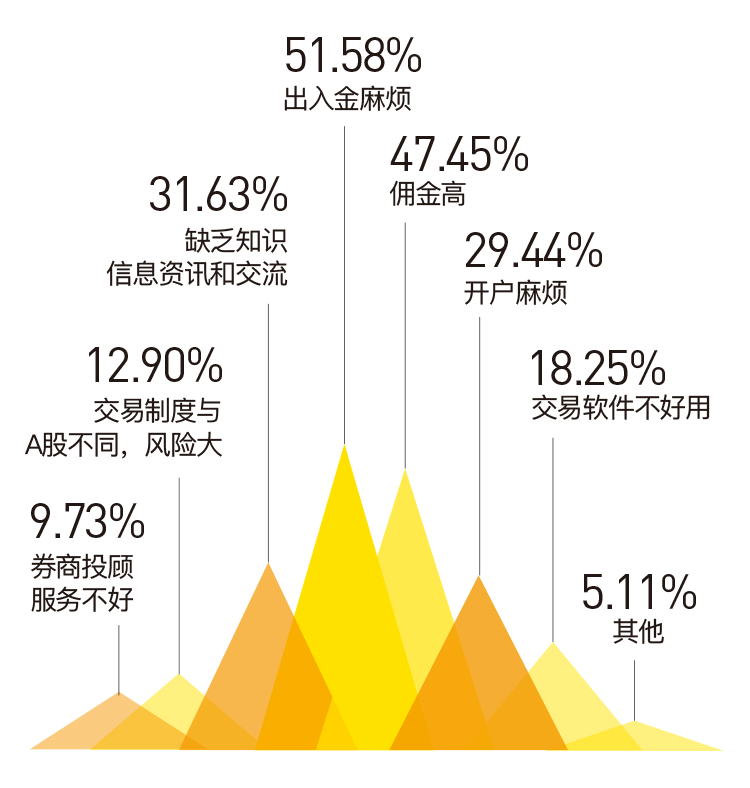 不过出入金麻烦以及券商收取的佣金高已成为影响交易体验的主要原因。另外,缺乏知识、信息资讯和交流、开户麻烦和交易软件不好用也成为投资港股不容忽视的障碍。